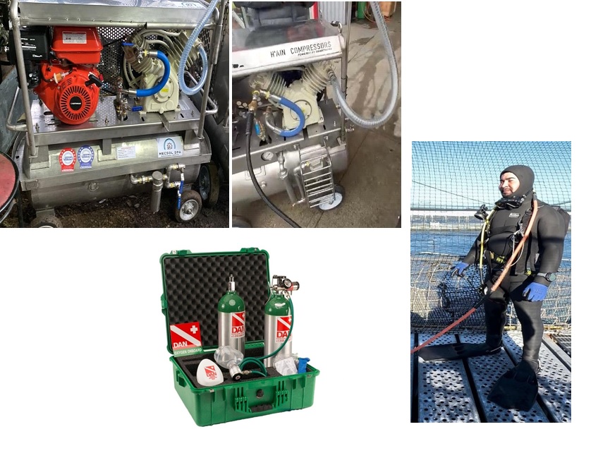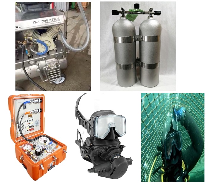Implementos de un Buceo Intermedio, se compone de Consola de comunicación y mascara km 48, Compresor 120 l., Banco bi-botella 24 l (total 48l)